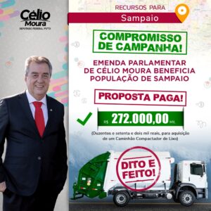 SAMPAIO: Atendendo a uma solicitação do diretório Municipal do partido dos trabalhadores (PT), e da professora Coracy, pré-candidata à prefeita do município, o Deputado Federal Célio Moura, (PT) que tem um olhar sensível aos problemas enfrentados pela população na região do Bico do Papagaio. Direcionou uma emenda parlamentar no valor de R$ 272.000,00(Duzentos e setenta e dois mil reis) para a compra um carro compactador para o recolhimento do lixo no município, haja vista, esse processo está sendo feito de forma inadequada. Esse veículo, vai melhorar o trabalho dos garis, além de acomodar o lixo de forma mais segura, para evitar acidentes e contaminação dos trabalhadores. Essa é mais uma conquista para beneficiar o povo de Sampaio, com ajuda do nosso deputado Federal Célio Moura. Concluiu a professora Coracy