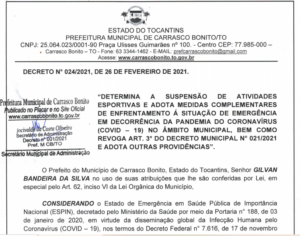 O prefeito de Carrasco Bonito, Gilvan Bandeira (DEM) publicou decreto nessa sexta feira 26 onde ficam suspensas todas as atividades esportivas no âmbito do município até o dia 31 de maio. As medidas foram tomadas para combater a disseminação causada pelo novo corona vírus dado ao recente crescimento no número de casos em todo o território nacional e na localidade. Carrasco Bonito já esteve com boletins zerados por algum tempo mais nos últimos dias os números têm crescido muito. Veja a integra do decreto: