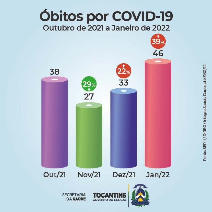 Outro dado preocupante para as áreas técnicas são as internações em UTI, que subiram 316% se comparado as 212 de janeiro de 2022 com as 51 internações de dezembro de 2021. “Acreditamos que seja um reflexo das festividades de final de ano e do advento da nova variante ômicron, que já está em contaminação comunitária no Estado. Por isso, mais uma vez pedimos, à população, o zelo com os cuidados pessoais básicos como utilização de máscara e álcool em gel, a não aglomeração e, por fim, a vacinação de todos”, afirma o titular da SES-TO, Afonso Piva.