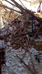 A estrutura do telhado inteiro desabou. O local ficou tomado pela madeira, telhas e pelo forro de gesso.