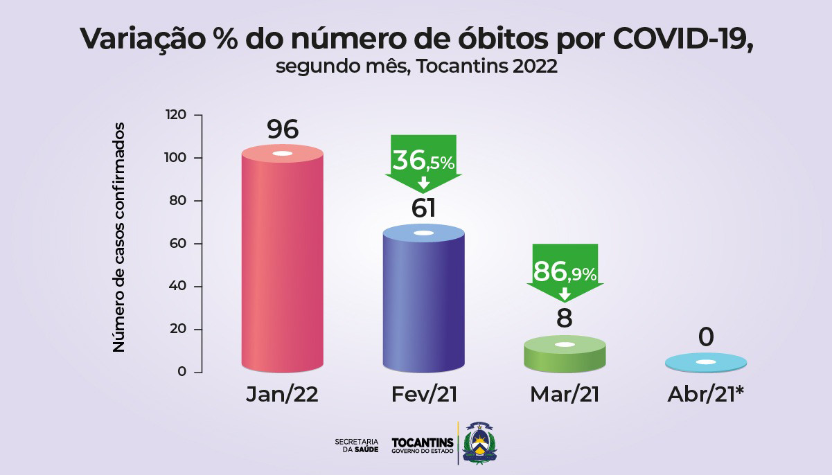O levantamento realizado constatou que o Tocantins registrou um pico da doença no mês de janeiro deste ano, com 42.381 casos confirmados e 96 óbitos, aumento relacionado à introdução da nova variante Ômicron, mais contagiosa e menos letal. No mês de fevereiro, com a ampliação da população vacinada, os índices começaram a baixar, sendo apontados 20.370 casos confirmados. Março fechou com 1.700 casos positivos; e no mês de abril, até o dia 10, foram 75 confirmações da doença.