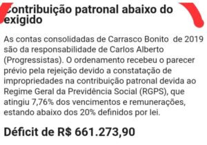 As sessões ordinária da Câmara Municipal de Carrasco Bonito referente ao mês de setembro, irão acontecer na próxima semana, na pauta principal das votações estarão as contas do ex-prefeito Carlos Alberto, as contas do ex-gestor já passaram por duas votações em sessões anteriores, com anulação posterior conforme publicação aqui mesmo https://gazetadobico.com.br/10727-2/ as contas se referem aos ano de 2016 e 2019, com reprovação do Tribunal de Contas do Estado do Tocantins, por conterem um déficit de R$ 671.273,90 ( Seiscentos e setenta e um mil, duzentos e setenta e três e noventa) https://gazetadobico.com.br/carrasco-bonito-vereadores-reprovam-contas-de-ex-gestor-em-1o-turno-voltam-atras-e-aprovam-em-2o/ conforme matéria também aqui publicada, na ocasião recebeu reprovação pelos vereadores, Jhonatan Rodrigues, Francisco Pereira Castro, Raimundo Nonato e José Martins, sendo que na eleição em 2º turno que aconteceu um dia depois da primeira os vereadores Raimundo Nonato (Raimundin do Tereza) e José Martins (Gazim da 20 Mil) mudaram os votos aprovando as referidas contas, que em seguida foram anuladas através de decreto legislativo.