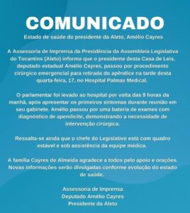 A assessoria de imprensa do presidente da Assembleia Legislativa do Tocantins (Aleto), deputado estadual Amélio Cayres (REPU), informou que o parlamentar passou por procedimento cirúrgico emergencial para retirada do apêndice na tarde desta quarta-feira, 17, no Hospital Palmas Medical.