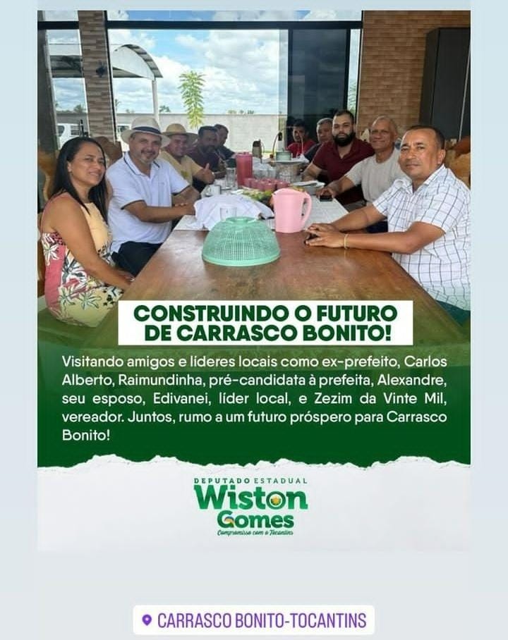 Desde que foi eleito o deputado estadual araguatinense tem visitado vários municípios do estado e de modo especial em sua região o nosso bico do papagaio. Nessas aparições destacamos uma ainda no início de sua caminhada pós eleição no município de Carrasco Bonito, onde o parlamentar aparecia ombreado com o médico e Dr. Robson Sousa pré-candidato a prefeito daquela municipalidade, esse encontro se deu em março de 2023 conforme matéria produzida e por sua assessoria de imprensa e posteriormente postada em veículos da região https://gazetadobico.com.br/noticia/2930/deputado-wiston-gomes-visita-liderancas-em-carrasco-bonito , até então tudo certo. Porem numa segunda aparição já divulgada nesse final de semana o deputado já aparece com o ex-prefeito Carlos Alberto ao lado da pré-candidata dona Raimunda e seu esposo Alexandre Gonçalves e em banner amplamente divulgado em redes sociais.