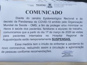 Seguindo as orientações do governo do estado, o hospital regional de Augustinópolis através de sua diretora administrativa Kelmanny de Alencar Moraes Alves, suspendeu as visitas a pacientes internados a partir do dia 17 de março, a medida visa proteger o paciente, servidores e também os familiares que buscam a instituição todos os dias para saber notícias de familiares internados.